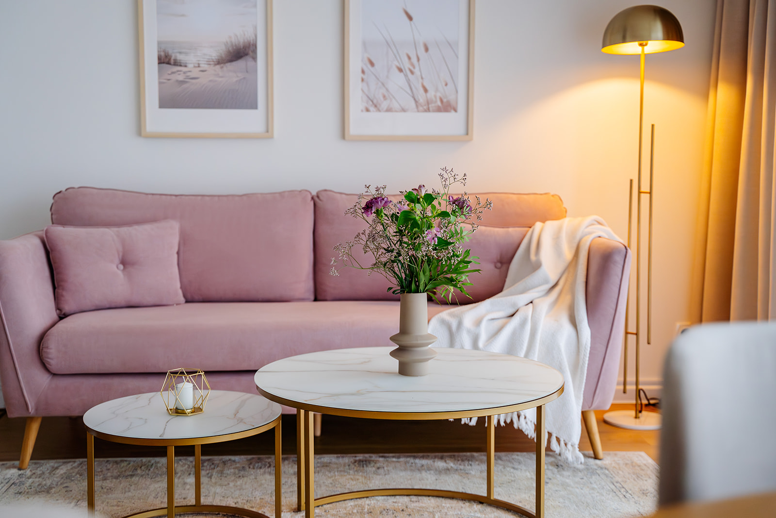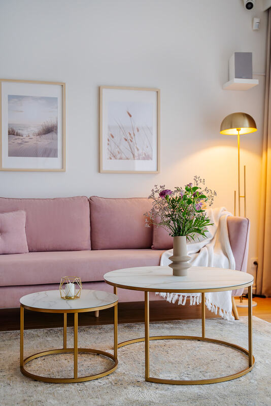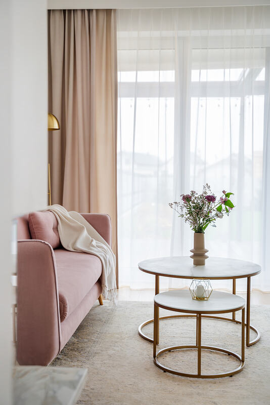 Przytulne wnętrza, z nutą elegancji. Wprowadziliśmy do salonu zgaszony róż - który dodaje życia we wnętrzu.